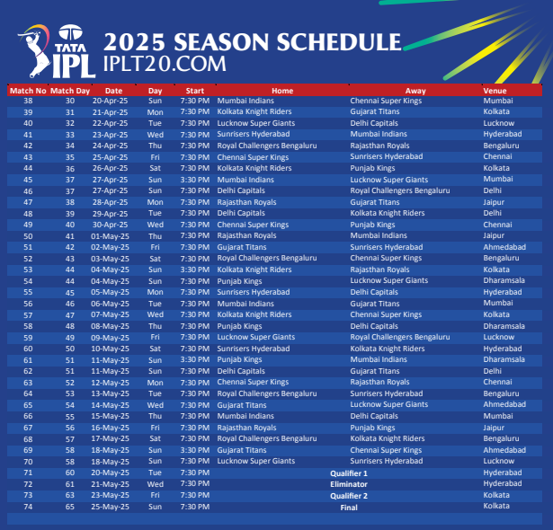 IPL 2025માં ગ્રુપ સ્ટેજની 70 મેચો રમાશે. આ પછી લીગની ટોચની 4 ટીમો પ્લેઓફ માટે ટકરાશે. આ વખતે પ્લેઓફમાં પ્રથમ મેચ એટલે કે ક્વોલિફાયર-1 20મી મેના રોજ રમાશે. એલિમિનેટર મેચ 21 મેના રોજ જ્યારે ક્વોલિફાયર-2 માટે મેચ 23 મેના રોજ યોજાશે. છેલ્લે 25 મેના રોજ ફાઇનલમાં બે ટીમો ટાઇટલ માટે ટકરાશે.