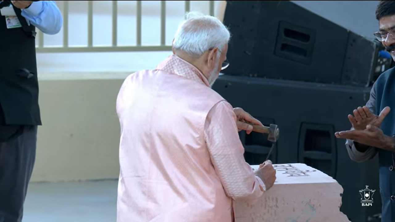 વડાપ્રધાન નરેન્દ્ર મોદીએ UAEના અબુધાબી ખાતે નવનિર્મિત BAPS સ્વામિનારાયણ મંદિરનું ઉદ્ઘાટન કર્યા ભગવાન સ્વામિનારાયણની પ્રતિમાના દર્શન કર્યા હતા. દર્શન બાદ પીએમ મોદીએ સમગ્ર મંદિરના દર્શન કરીને બેનમૂન નકકાશી કામ નિહાળી હતી. બાદમાં, પીએમ મોદીએ ખૂબ હથોડી અને ટાંકળી લઈને શિલ્પકારી પર હાથ અજમાવ્યો હતો. વડાપ્રધાન નરેન્દ્ર મોદીએ શિલ્પકારી કરીને અનોખી સંદેશ પાઠવ્યો હતો. તેમણે જે શિલ્પ પર પ્રતીકાત્મક શિલ્પકારી કરી હતી તેના પર વસુધૈવ કુટુંબકમ લખેલું હતું. આમ પીએમ મોદીએ સમગ્ર વિશ્વને વસુધૈવ કુટુંબકમનો સંદેશ આપ્યો.