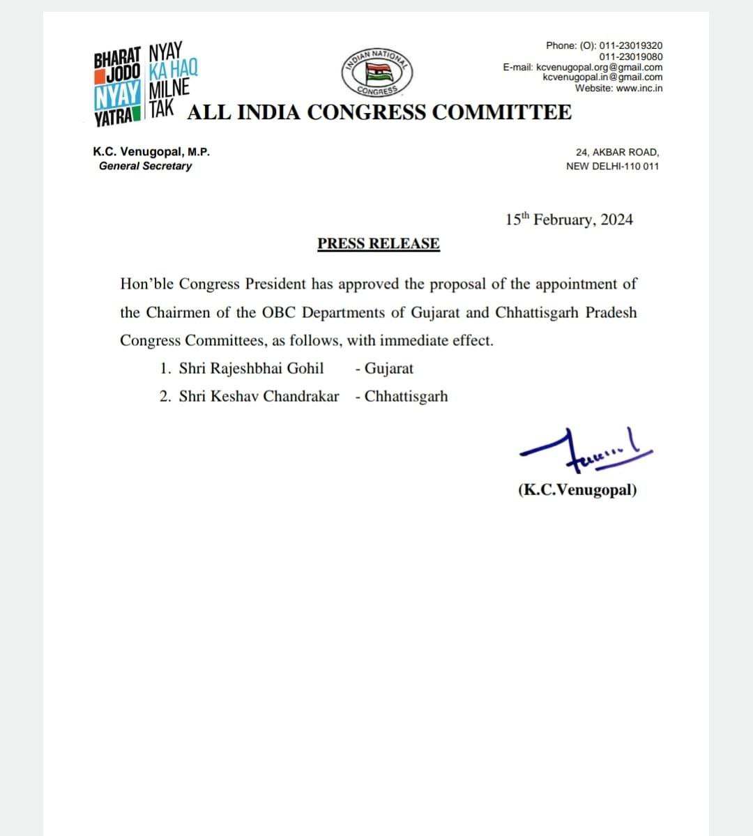 - રાજેશ ગોહિલને ગુજરાત OBC વિભાગના અધ્યક્ષ